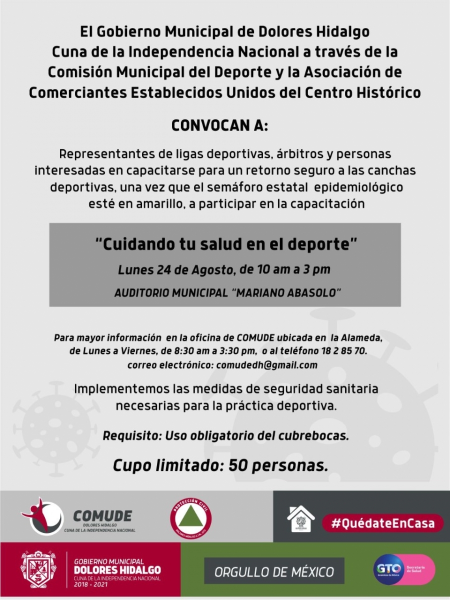 DOLORES HIDALGO CUNA DE LA INDEPENDENCIA NACIONAL, GTO.- Procurando el retorno seguro a la actividad deportiva, la Administración 2018-2021 presidida por el Alcalde Miguel Ángel Rayas Ortiz, invita a la ciudadanía en general a participar en la capacitación “Cuidando tu Salud en el Deporte”, a través de la cual abordarán temas de prevención del contagio por covid-19 en el ámbito deportivo.