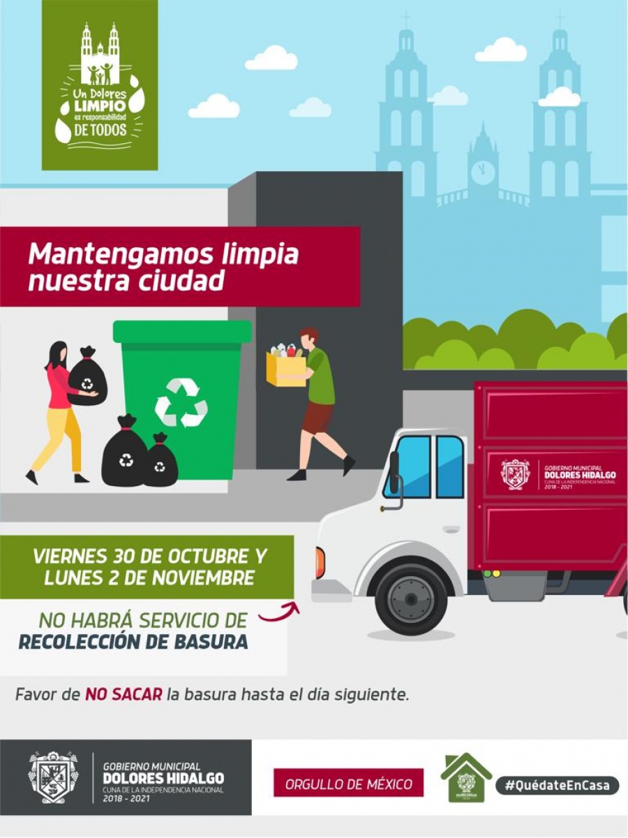 DOLORES HIDALGO CUNA DE LA INDEPENDENCIA NACIONAL, GTO.- El Gobierno Municipal 2018-2021, informa a la población dolorense de la suspensión del servicio de recolección de basura durante los días 30 de octubre y 2 de noviembre del presente año, por lo que se pide de su colaboración para considerar las medidas necesarias y evitar sacar los desechos a la vía pública.