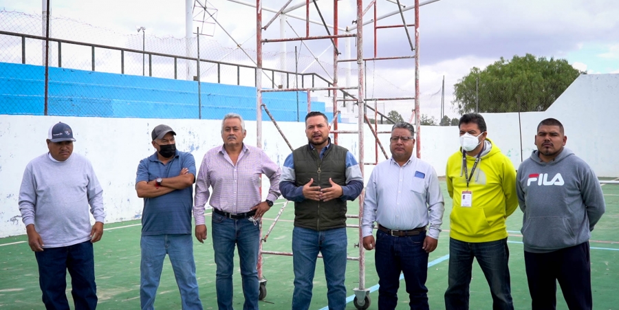 Supervisa el alcalde Erick Montemayor junto con funcionarios la construcción del domo en la cancha de usos múltiples de la Unidad Deportiva Municipal.