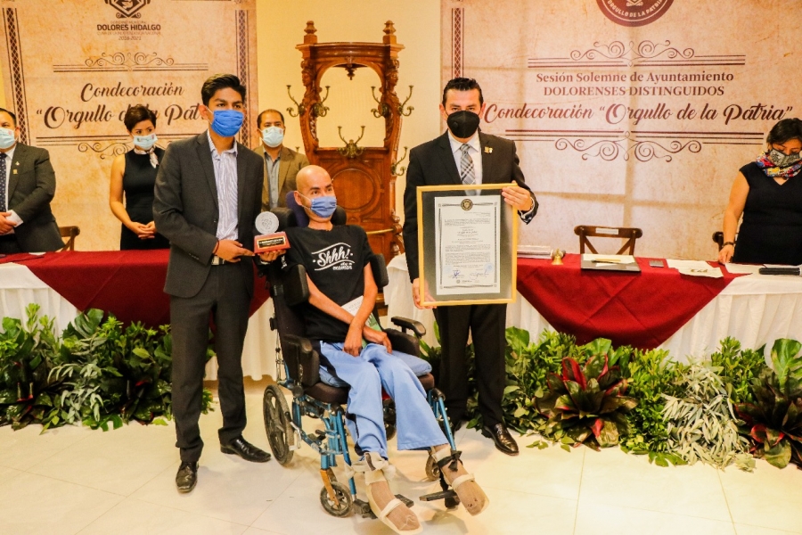 DOLORES HIDALGO CUNA DE LA INDEPENDENCIA NACIONAL, GTO.- Reconociendo el esfuerzo y la dedicación de dolorenses distinguidos en diferentes rubros artísticos, literarios y productivos, el Presidente Municipal Miguel Ángel Rayas Ortiz y los integrantes del Ayuntamiento 2018-2021, entregaron la Condecoración “Orgullo de la Patria” a tres dolorenses que con su quehacer han enaltecido a la Cuna de la Independencia Nacional.