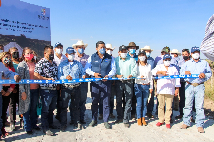 En la visita realizada al municipio de San Felipe, el martes 27 de octubre, el Gobernador de Guanajuato Diego Sinhue Rodríguez Vallejo, realizó la inauguración del camino Nuevo Valle de Moreno a San Antonio de las Alazanas, así como la entrega de apoyos de los programas de “Profesionalización Agropecuaria” y “Mi Patio Productivo”, que realiza el Gobierno del Estado a través de la Secretaría de Desarrollo Agroalimentario y Rural (SDAyR).
